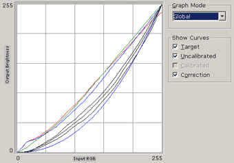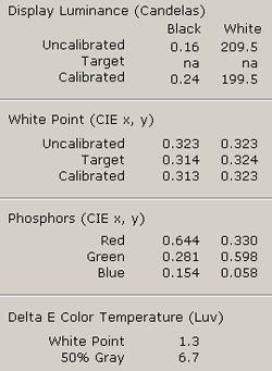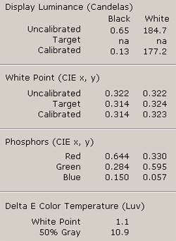 Глаза нас не обманули: при заводских настройках яркость белого оказалась всего 185 Кд, а черного — 0,65 Кд. Оба параметра весьма обычны, как и высчитываемое соотношение контрастности в 284:1. Помните обещанные 1000:1? А вот и получите — 1363:1! Но после аппаратной калибровки. Представляете насколько плохо настроен монитор инженерами завода?!