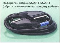 Здесь уместно сказать о том, что на волне продвигаемого интереса к «супер»-кабелям (акустическим, аудио и др.) известные их производители предлагают и SCART-кабель, лишенный, как они утверждают, существующих недостатков. Внешне он очень эффектен — толстый блестящий жгут из раздельных экранированных аудио и видеокабелей, металлические или металлизированные (как на рисунке) разъемы, позолоченные контакты. Его стоимость начинается с 15-20 долларов, но вряд ли стоит ожидать от такого кабеля заметной отдачи, ведь разъем в вашем видеомагнитофоне или телевизоре остается тем же.