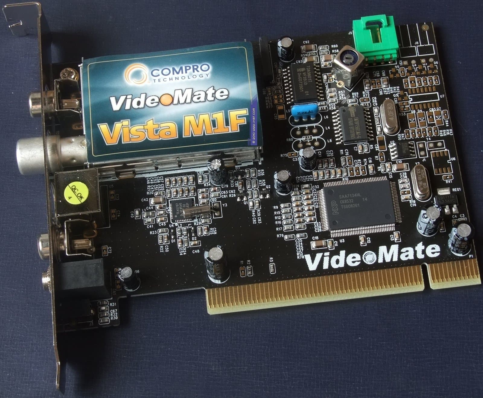 Compro VideoMate Vista M1F — TV-тюнер и FM-тюнер с интерфейсом PCI. Селектор TVF85P4-AF-XG с VIF-PLL-демодулятором NXP TDA9801T, 9-разрядный декодер NXP SAA7134HL.