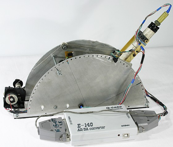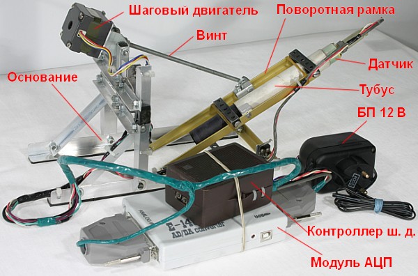 Провисание нитки устраняется действием веса рамки и датчика, а в верхней мертвой точке — резинкой «для купюр». В приводе используется моторчик и редуктор от привода лотка старого CD-ROM-дисковода. Моторчиком управляет драйвер TA8409F от TOSHIBA (извлеченный из того же дисковода), питание и команды эта микросхема получает от модуля E-140. Крайние положения фотодатчика определяются с помощью двух концевых замыкающих датчиков (тоже от CD-привода). Промежуточные положения подвижной рамки детектируются оптическим датчиком (ИК-диод — фототранзистор), работавшим когда-то в НГМД 5-ти-дюймового формата. При движении рамки этот датчик фиксирует прохождение отверстий, просверленных с определенным шагом по периметру одного из полукругов. Выходы всех датчиков подключены к цифровым (TTL) входам модуля E-140, который по интерфейсу USB подключен к компьютеру и служит посредником между ним и установкой. Электрическая схема установки приведена тут.