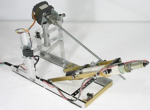 Труднее всего оказалось создать компактный, управляемый программой на компьютере, привод, поворачивающий рамку с датчиком. Первой и неудачной попыткой была конструкция из двух половинок грампластинки, закрепленных на рамке-основании, при этом рамка с датчиком должна была перемещаться с помощью двух резиновых роликов, катящихся по тому, что было ребром изделия апрелевского завода. Ролики вращались моторчиком с редуктором. В принципе, все это даже как-то вращалось и перемещалось, но после того, как при попытке просверлить отверстия для датчика угла, кусок пластинки откололся, виниловые полукруги были заменены дюралевыми, за которые ролики не цеплялись. Пришлось придумывать другой привод.