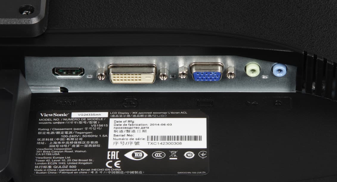 Монитор оснащен тремя входами: DVI-D, HDMI и VGA. Вход HDMI способен принимать цифровые аудиосигналы (только PCM стерео), которые выводятся после преобразования в аналоговый вид на встроенные громкоговорители и через гнездо миниджек 3,5 мм. К этому гнезду можно подключить внешнюю активную акустическую систему или наушники. Звук в аналоговом виде можно завести через второй разъем миниджек 3,5 мм. Встроенные громкоговорители звучат согласно их размерам и акустическому окружению — не очень громко, без низких частот вообще, с выраженным «пластиковым» призвуком и со слабым стереофоническим эффектом. Мощности выхода хватило, чтобы в 32-омных наушниках с чувствительностью 112 дБ был небольшой запас по громкости. Качество звука в наушниках хорошее — воспроизводятся все частоты, в паузах шума не слышно. Громкость регулируется в меню, там же звук можно отключить и в случае HDMI принудительно выбрать аналоговый аудиовход.