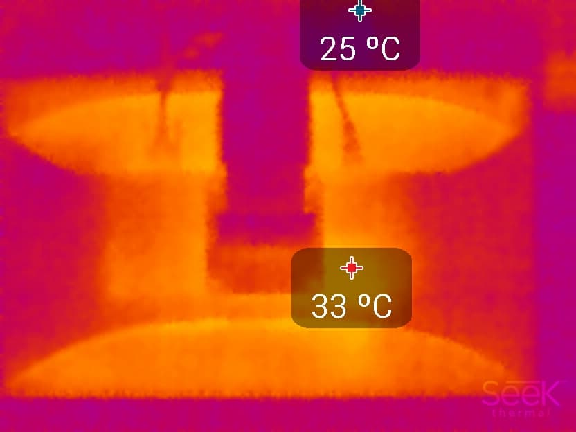 Видно, что задняя панель греется несильно (максимум 33 °С), тогда как нижняя часть экрана нагревается до 41 °С (видимо, там находится светодиодная линейка подсветки экрана). Метки максимума и минимума температуры перевернуты и, видимо, сдвинуты, и шкалы нет, но таковы особенности теплокамеры и ПО к ней.