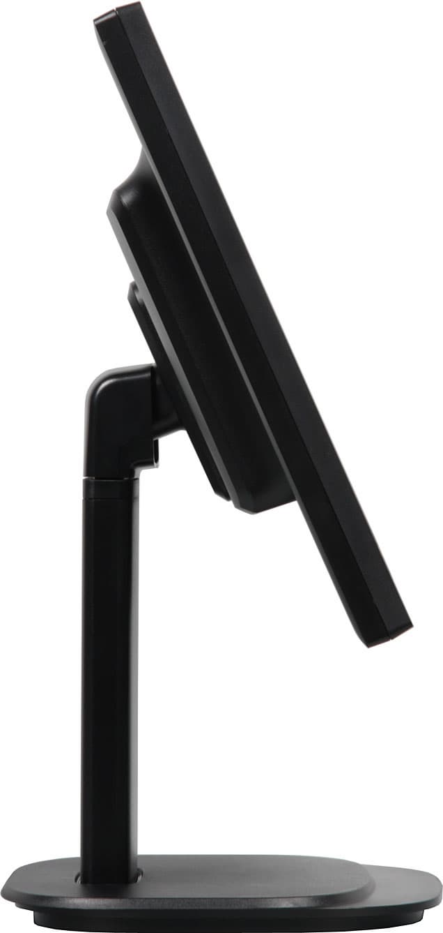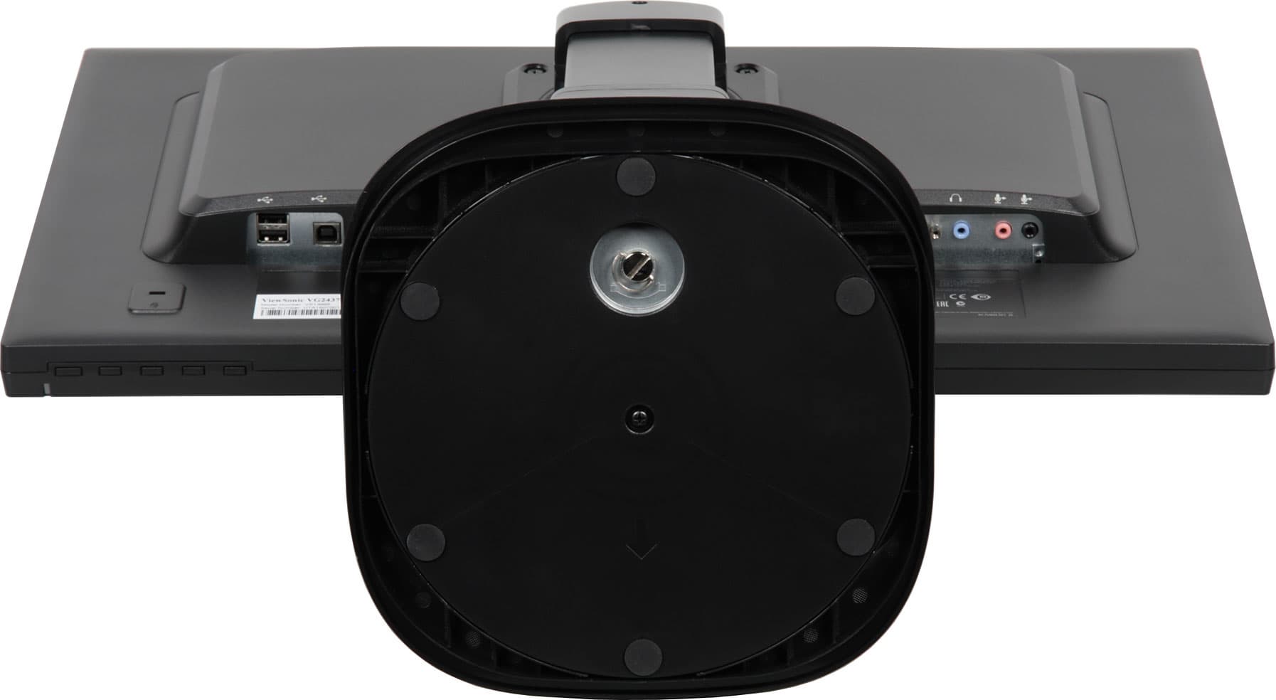 Основание подставки относительно большое по площади, но оно сверху в основном плоское и горизонтальное, что повышает эффективность использования рабочей площади стола. Монитор стоит на подставке устойчиво. Конструкция подставки достаточно жесткая, так как несущие элементы подставки изготовлены из толстой штампованной стали или отлиты из алюминиевого сплава. Резиновые прокладки по периметру диска из пластика с небольшим коэффициентом трения, закрепленного центральным винтом снизу на основании подставки, защищают поверхность стола от царапин и предотвращают непредвиденное перемещение монитора на гладких поверхностях.