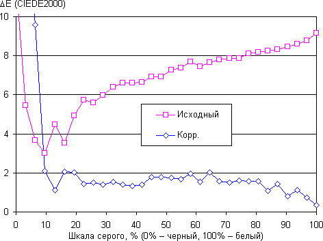 Цветопередача даже при выборе лучшего из предустановленных вариантов немного отличается от стандартной, поэтому мы попытались вручную скорректировать цвета, регулируя усиление трех основных цветов. Графики ниже показывают цветовую температуру на различных участках шкалы серого и отклонение от спектра абсолютно черного тела (параметр ΔE) в случае профиля Исходный и после ручной коррекции: