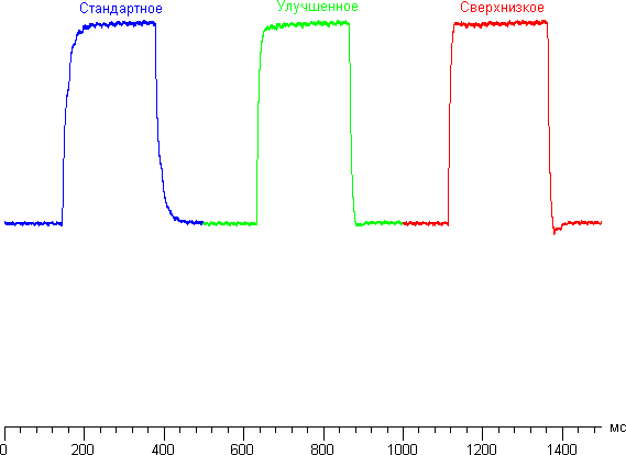 Даже для *VA матрица очень медленная, все портит большое время включения. Для иллюстрации ниже приведены графики полутонового перехода между оттенками 40% и 60% и обратно при различных значениях настройки Время отклика (по вертикали — яркость, по горизонтали — время, для наглядности графики выстроены последовательно):