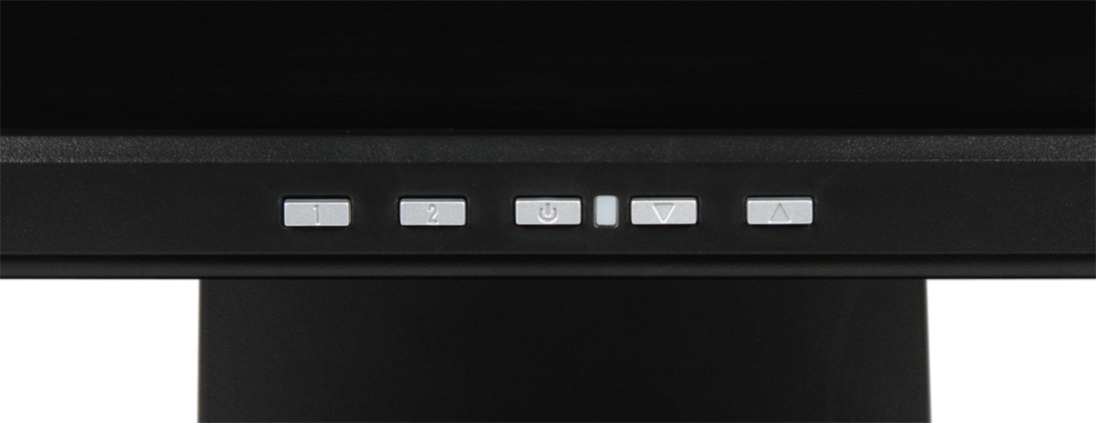 Индикатор питания при работе довольно ярко светится синим, в режиме ожидания неярко оранжевым и не горит, если монитор выключен. Постоянную подсветку индикатора питания можно отключить через меню установок. Если на экране нет меню, то нажатие на первую кнопку его выводит, на вторую — переключает входы, на кнопку «вниз» — выводит окошко с ползунком яркости, «вверх» — окошко с ползунком контрастности.