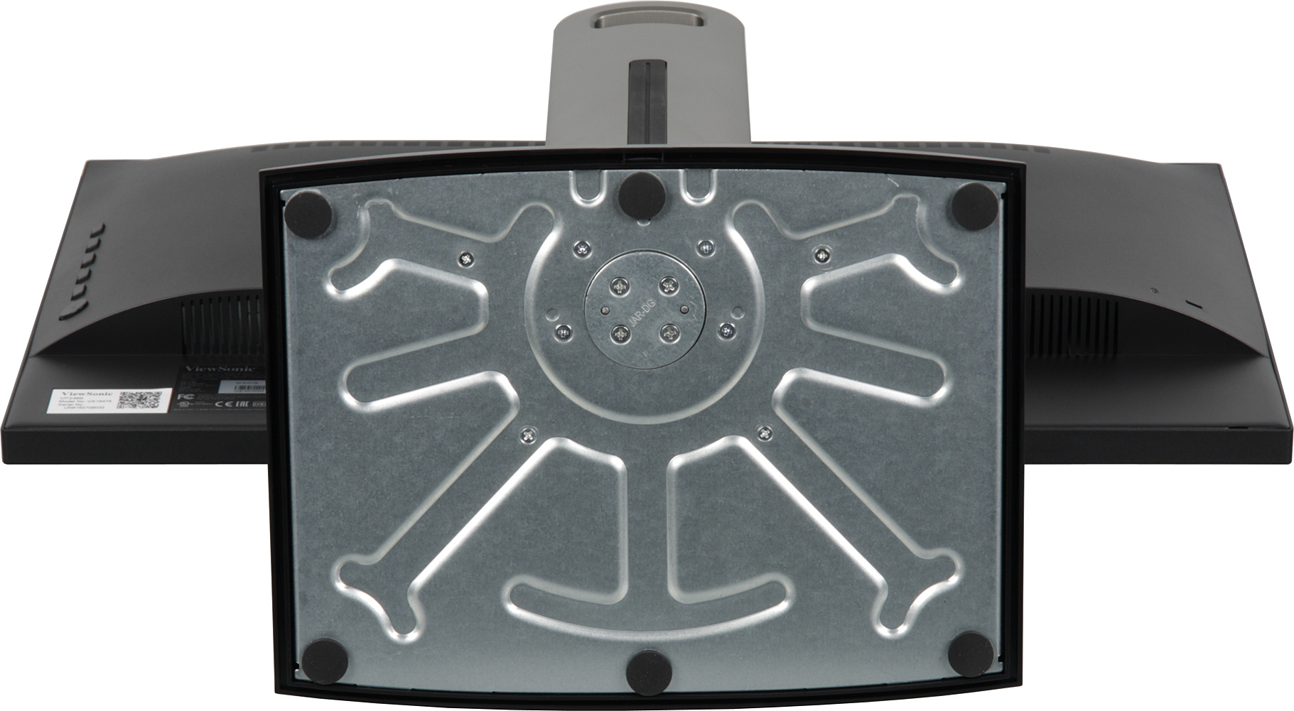 Значок на кнопке питания является индикатором состояния. Вверху на задней панели — вентиляционная решетка. Разъем питания и интерфейсные разъемы расположены на срезе утолщения сзади и ориентированы вниз. Традиционно присутствует и разъем для кенсингтонского замка. Монитор оснащен встроенным блоком питания. Стойка закреплена на металлическом поворотном круге, который сверху имеет узор из концентрических бороздок и покрыт черной эмалью. Стойка имеет фиксированную высоту, но подпираемый пружиной механизм со стальным рельсовым шариковым подшипником обеспечивает вертикальное перемещение шарнира, на который крепится блок экрана. Резиновая полоска-заглушка сзади на стойке прикрывает несколько отверстий в раме стойки. В нижнее можно вставить проволочную чеку, идущую в комплекте, и заблокировать, тем самым, шарнир в нижнем положении. В одно из четырех других с резьбой М4 можно ввинтить винт так, чтобы он зашел в отверстие на шарнире, это зафиксирует шарнир в одном из четырех положений по высоте. Правильно подобранная длина винта и его шляпка позволят затем установить заглушку на место. Вырез в верхней части стойки формирует удобную ручку для переноски монитора в сборе. Штатная подставка позволяет блок экрана немного наклонить вперед, отклонить назад, приподнять, повернуть вправо-влево и перевернуть в портретную ориентацию как по, так и против часовой стрелки.
