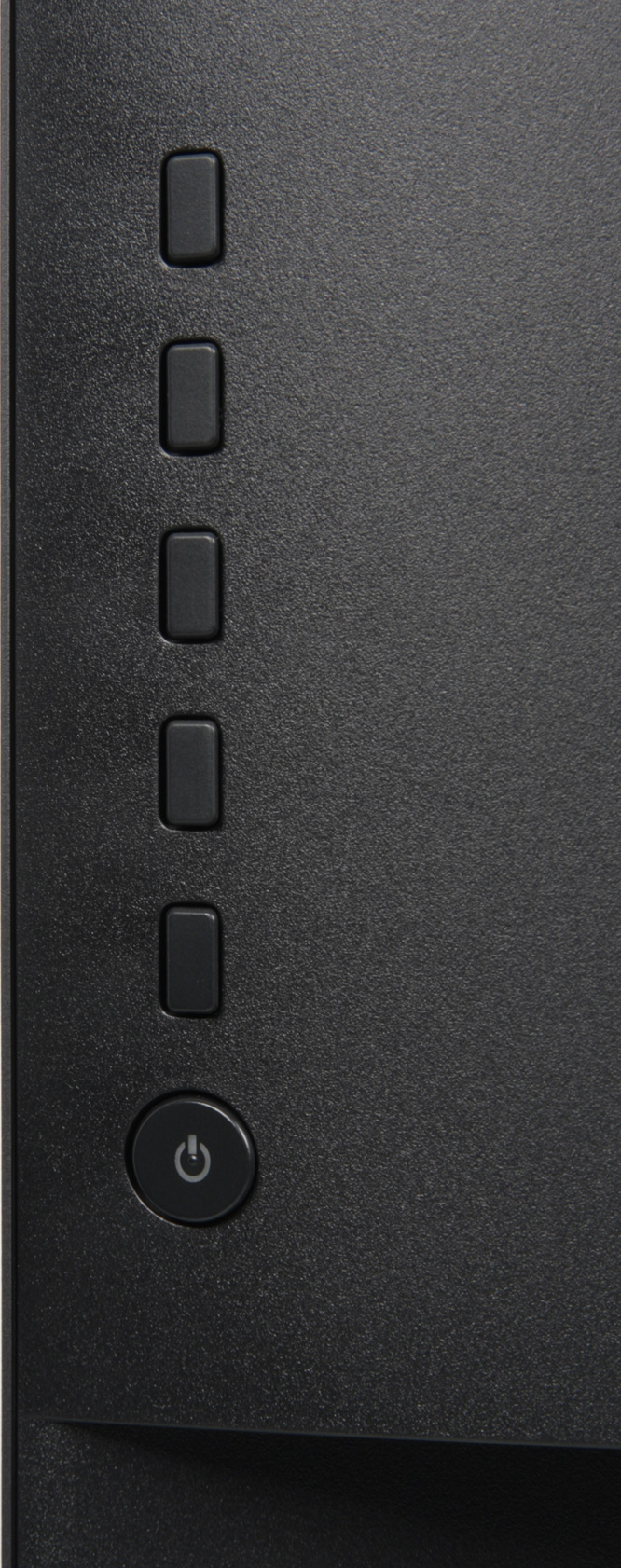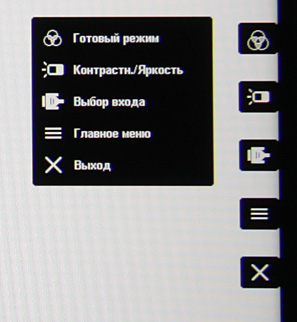 Индикатор питания при работе неярко светится синим (отключается в меню), в режиме ожидания — красным и не горит, если монитор условно выключен. Кнопка питания легко определяется на ощупь, но при желании ее можно заблокировать, исключив тем самым непреднамеренное выключение монитора. Когда монитор включен и на экране нет меню, то при первом нажатии на любую кнопку, кроме кнопки питания, на экран выводится стартовое меню в виде пяти значков точно напротив кнопок и пояснительного окошка.