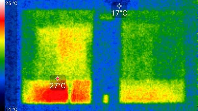 Задняя панель греется несильно — максимум 29 °С. Нагрев спереди у нижнего края матрицы достигает 34 °С, видимо, там находится светодиодная линейка подсветки экрана.