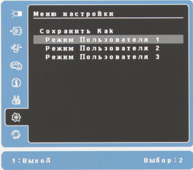 Можно выключить слабую прозрачность фона, установить тайм-аут автоматического выхода из меню. Также меню можно передвинуть по горизонтали и по вертикали и перевернуть на 90 градусов против часовой стрелки. Запоминается пункт верхнего уровня, к которому предыдущий раз обращался пользователь. Какие-то настройки можно сохранить в трех ячейках, но что именно сохраняется, мы не выясняли, а руководство в части описания функциональности уж очень аскетичное.
