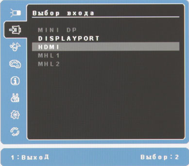 Монитор оснащен пятью цифровыми входами: два DisplayPort в полноразмерной версии и миниатюрной, HDMI версии 2.0 и еще пара HDMI, видимо версии 1.4. Эта пара HDMI поддерживают подключение по MHL 2.0 (точно до Full HD при 60 кадр/с) — проверено на смартфоне Sony Xperia Z3+). Самое удивительное, в коробке с монитором мы обнаружили соответствующий кабель-переходник с HDMI на Micro-USB. Входы выбираются кнопкой 2 или в меню (в списке подсвечены активные).