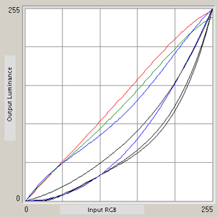 А вот настройка цветовых каналов заметно хуже, чем у NEC — разброс яркости резко начинается от 20% яркости и далее все три канала активно живут своей жизнью, «встречаясь» лишь при 100% яркости.
