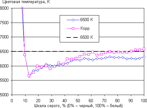 Такой спектр с несколькими выраженными пиками характерен для мониторов, в которых используются флуоресцентные лампы подсветки. Цветопередача при выборе профиля 6500 K несколько отличается от стандартной, поэтому мы попытались вручную скорректировать цвета, регулируя усиление трех основных цветов. Графики ниже показывают цветовую температуру на различных участках шкалы серого и отклонение от спектра абсолютно черного тела (параметр ΔE) в случае профиля 6500 K и после ручной коррекции профиля: