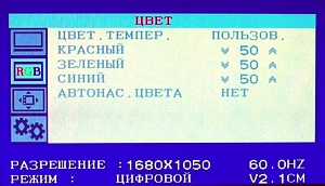 В цифровом подключении по DVI настройки меню цветовой температуры мониторы и подстройки уровней основных цветов недоступны. При необходимости эти настройки возможны только с помощью программной колибровки и создания цветового профиля видеоадаптера. При подключении по VGA эти меню (бледного синеватого цвета) доступны.