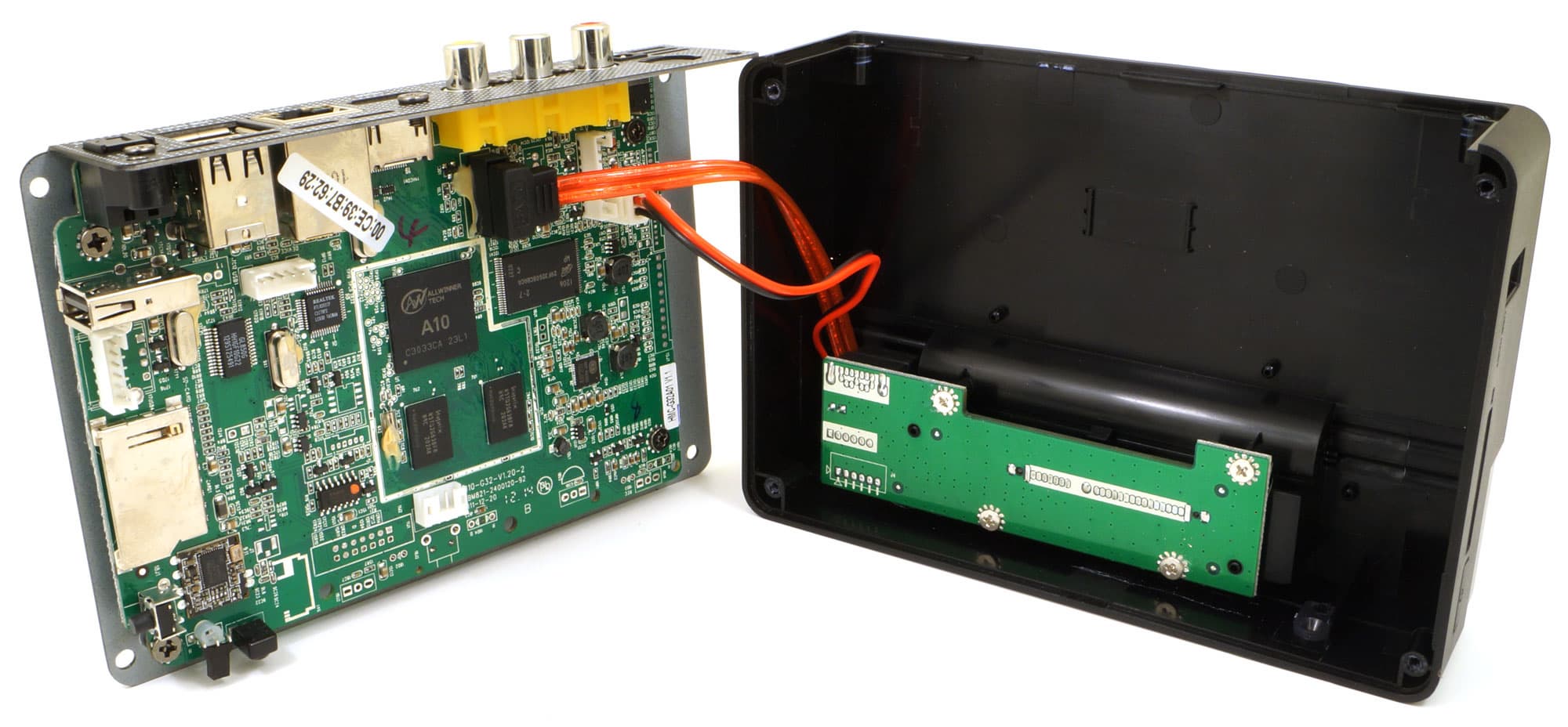 В разобранном состоянии обе половинки плеера скрепляют кабель питания и шина SATA, подсоединяемые к главной печатной плате.