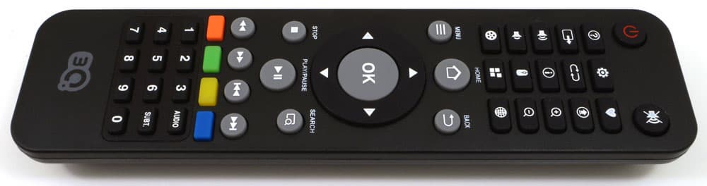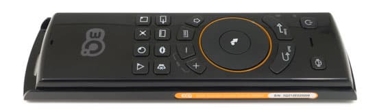Прилагаемый пульт ДУ внешне неотличим от аналогичных. Но если присмотреться к верхнему ряду кнопок, то можно заметить непривычные пиктограммы. Это — кнопки, позволяющие работать с Android-ным touch-интерфейсом. При желании можно задействовать режим мышки: одно нажатие на кнопку с пиктограммой мыши, и на экране появится курсор. Передвижение курсора по экрану в таком режиме осуществляется кнопками навигации, окружающими главную кнопку ОК.