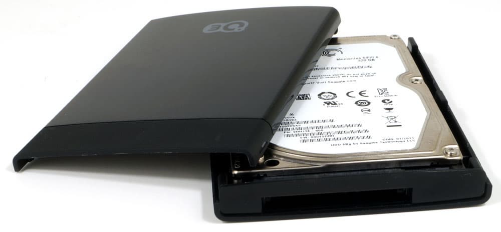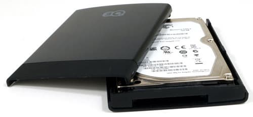 Жесткий диск (если таковой имеется, и если есть нужда в его установке) упаковывается в прилагаемый корпус-чехол, выполненный из глянцевого черного пластика. Половинки корпуса, сдвигаясь, надежно фиксируют накопитель.