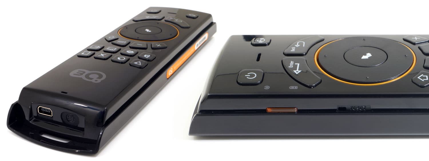 Представители компании 3Q любезно предоставили еще один гаджет, значительно облегчающий управление плеером. Этот двуликий пульт является симбиозом миниатюрной клавиатуры и мышки, работающих по радиоканалу (приемник сигнала в виде миниатюрной флэшки имеется в комплекте с пультом). Вот только, в отличие от обычной мышки, эту не требуется возить по какой-либо поверхности — находящийся внутри устройства чуткий гиродатчик отлично справляется с позиционированием курсора на экране. Следует лишь привыкнуть к такому способу управления.