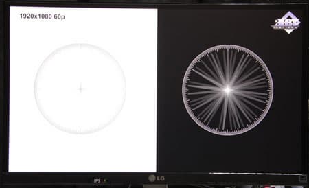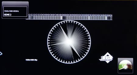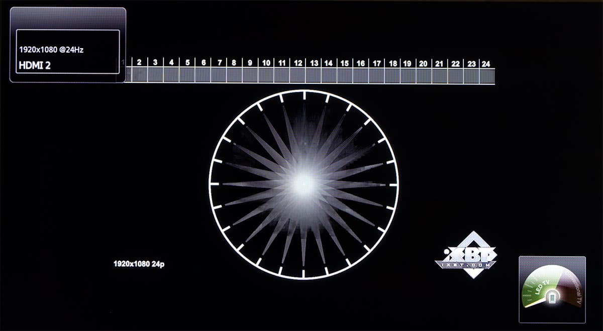 Ярчайшим образом продемонстрировать такой эффект можно, воспроизведя на рассматриваемом устройстве один из специальных видеофайлов. Он представляет собой несложную конструкцию с циферблатом и стрелкой на нем, делающей полный оборот на 360° за одну секунду. Вдобавок над циферблатом расположен ряд пронумерованных ячеек, по которым бегает белый прямоугольник, проходя путь от начала до конца также за одну секунду. Вот он, этот ролик: