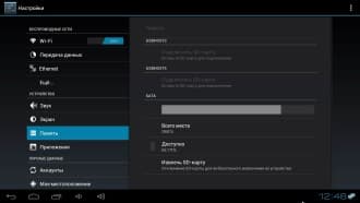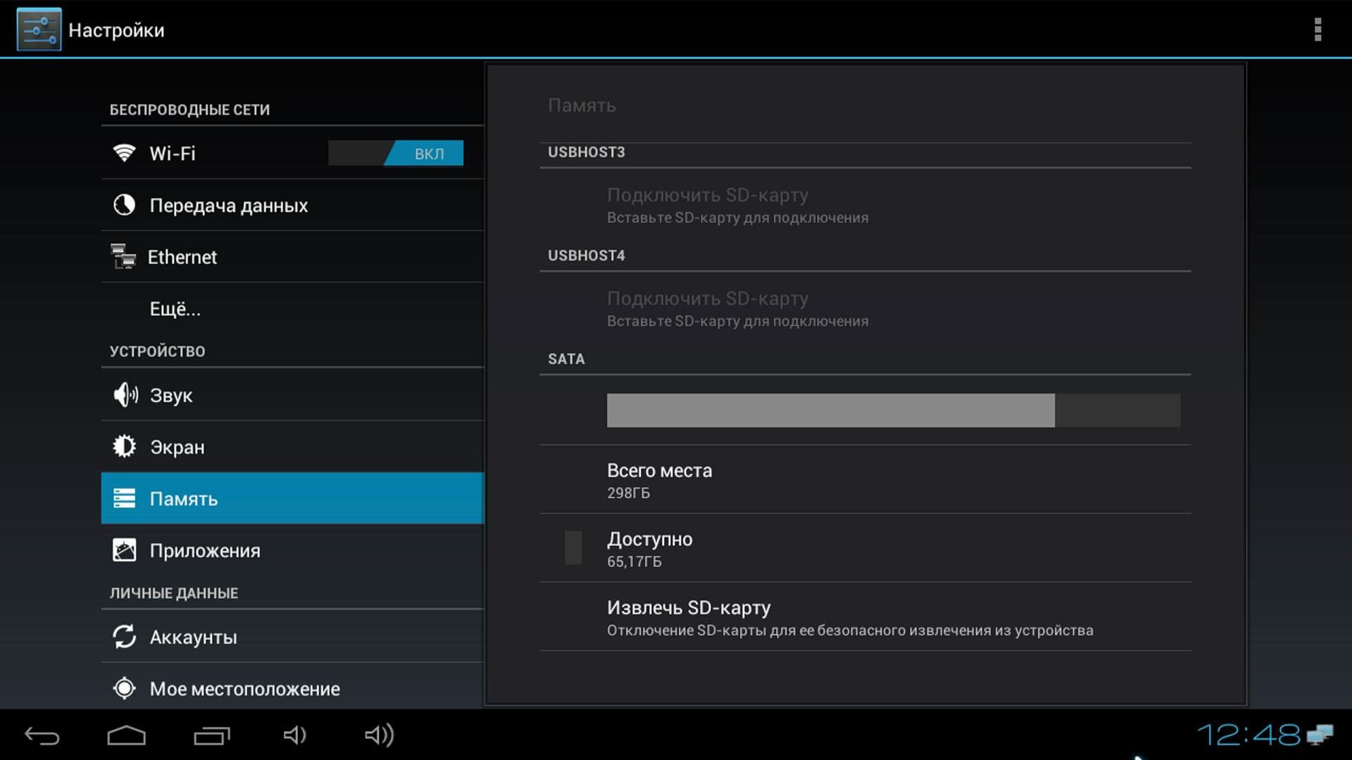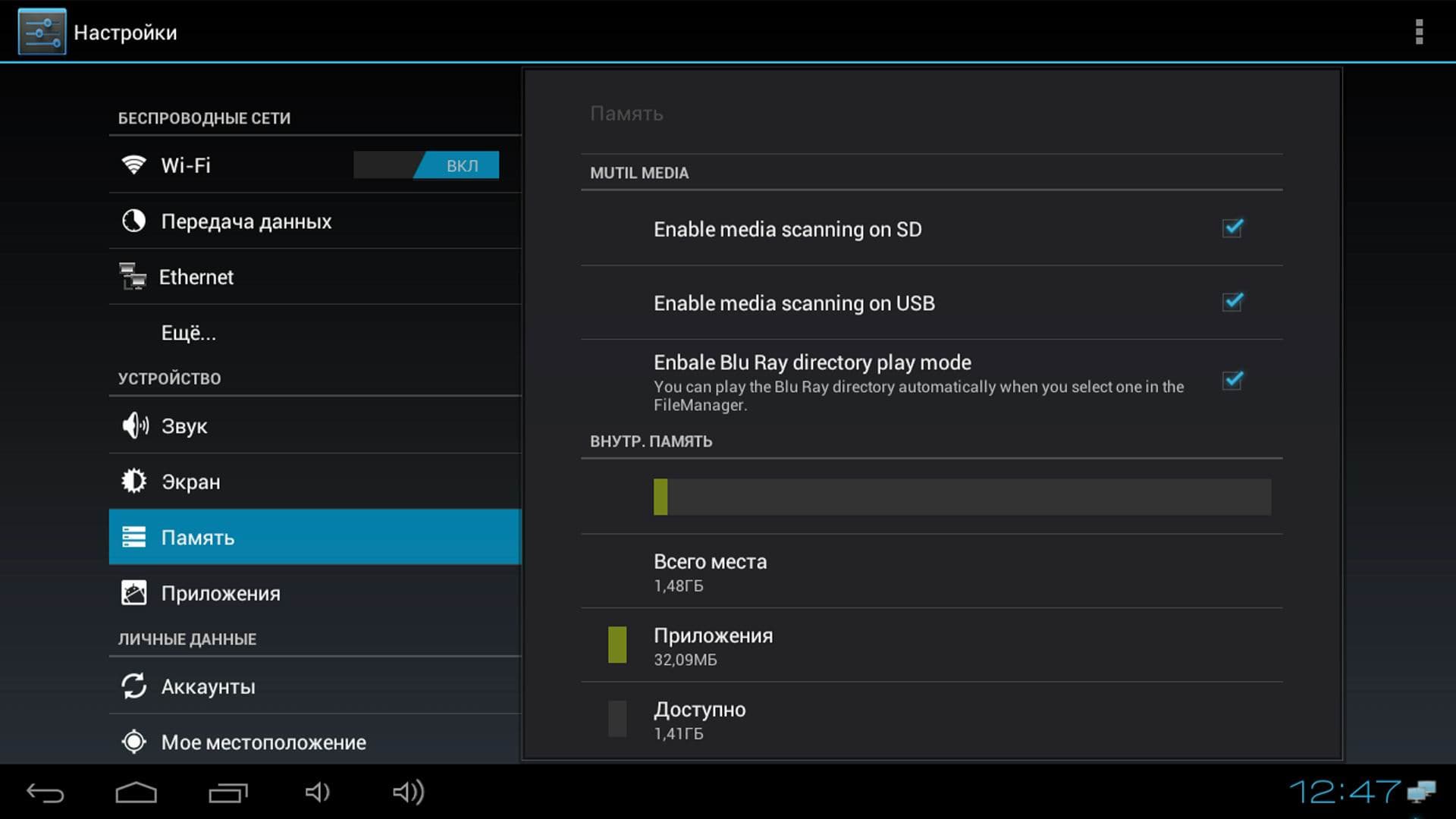 Пункт настроек «Память» содержит возможность активации функции воспроизведения директорий дисков Blu-ray (помогает в случаях, когда требуется воспроизвести скопированный диск Blu-ray, а не записанный в ISO-образ). Здесь же отображается заполненность SATA HDD, подключенного к плееру.