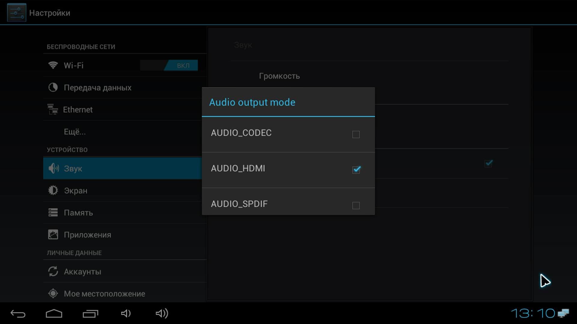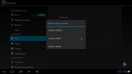 Что же касается настроек звука — они не отличаются от тех, что имеются в изученном ранее мини-ПК iconBIT Toucan Manta. Как видим, Android все еще не научился выводить ни многоканальный, ни HD-звук. Ни по HDMI, ни через выход S/PDIF. Все, что можно (пока) получить от подобных устройств — это стерео-PCM, выведенный по одному из следующих интерфейсов: