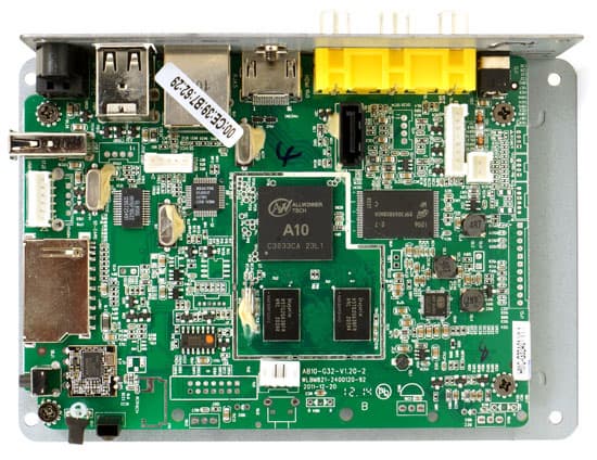 При взгляде на ту плату в первую очередь обращаешь внимание на центральный чип, он же — мозг устройства. Система на кристалле (SoC), разработанная компанией Allwinner Technology Co. Ltd., состоит из одноядерного центрального процессора ARM Cortex-A8 и графического процессора Mali 400. Видеоконтроллер, имеющийся здесь, позволяет декодировать видео с разрешениями аж до 2160p, а также в 3D-формате. Данными процессорами оснащена сегодня добрая половина недорогих Android-устройств (чаще планшеты), а причина такого выбора вполне понятна: недорого, но более чем достаточно для покрытия самых разных потребностей.
