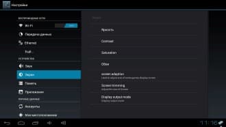 | Настройки экрана: яркость, контраст, насыщенность (изменяются ползунками), выбор обоев, функция адаптации экрана к играм, точная подгонка под конкретный экран/монитор, настройка разрешения и частоты | Выбор разрешений и частот, доступны значения: Auto, 480i, 480p, 576i, 576p, 720p 50Гц, 720p 60 Гц, 1080i 50 Гц, 1080i 60 Гц, 1080p 24 Гц, 1080p 50 Гц, 1080p 60 Гц. При композитном подключении список не меняется. |