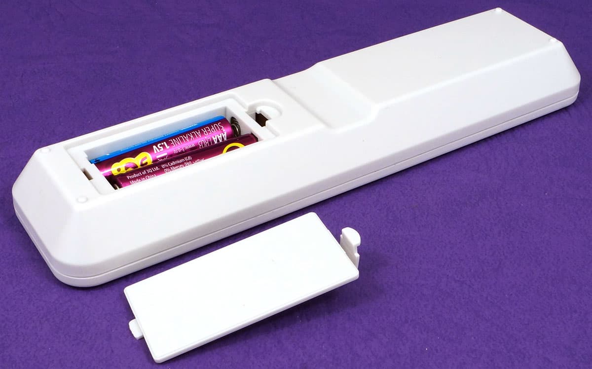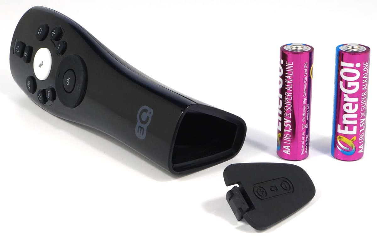 Пульт работает от пары АА-батареек, которые вставляются в дно корпуса. Кстати, примечательно, что в комплекте с устройством уже имеются эти батарейки, да не абы какие, а фирменные Super Alcaline 3Q QEnerGO!. Время работы пульта с батареями подобного типа сравнимо со временем работы обычного бытового ИК-пульта при сравнимом количестве нажатий кнопок. На практике это составляет от полугода до полутора лет в зависимости от интенсивности использования. Следует заметить: если пользователь часами играет в Angry birds, не выпуская пульта из рук, то и расход энергии будет соответствующим.