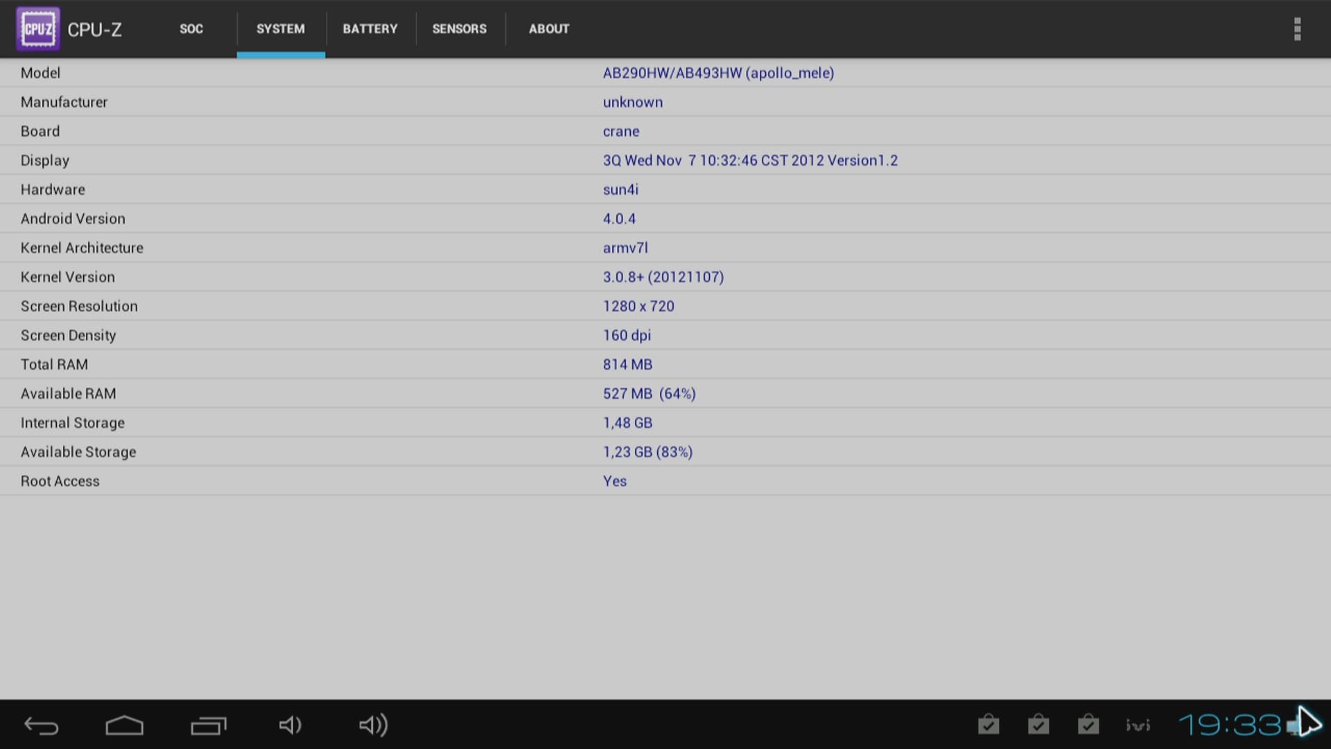 Электронная начинка рассматриваемого плеера напоминает имеющуюся в уже рассмотренном 3D Android-мини-ПК 3Q AB290HW. По этой причине мы не станем повторять уже пройденное, а интересующимся можно порекомендовать к прочтению обзор указанной модели, где настройки описаны достаточно подробно. Также следует отметить, что рассматриваемая приставка имеет отличный от 290-й модели дизайн, стремящийся к упрощению и минимализму: отсутствует встроенный HDD, отсутствуют дополнительные видео- и аудиовыходы, здесь одним портом USB меньше, на корпусе отсутствует аппаратная кнопка отключения питания, зато имеется аппаратная кнопка сброса «Reset». В остальном, как уже говорилось, характеристики аппаратов практически идентичны. Ниже приведены скриншоты приложения CPU-Z, запущенного на рассматриваемой приставке.
