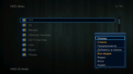 Интерфейс файлового браузера идентичен интерфейсу, который имеет упоминавшийся 3D-плеер 3Q F370HW. Здесь также доступно изменение способа представления материала: в виде списка, эскизами либо с окном предварительного просмотра.