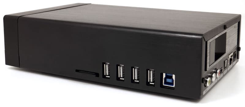Корпус медиаплеера вытянут в глубину, позже мы увидим причину такого дизайна. На одной из боковых стенок плеера в ряд расположены слот для карты памяти SD/SDHC, четыре (!) порта USB 2.0 Host для подключения внешних устройств (накопителей, клавиатур, адаптеров и т. д.) и, наконец, один порт USB 3.0 для соединения с ПК.