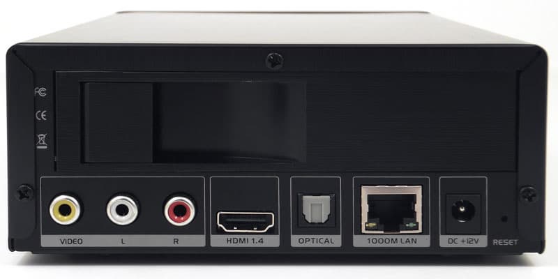 Нижняя часть задней панели устройства отдана другим интерфейсам: композитный видеовыход + стереоаудиовыходы, порт HDMI версии 1.4, оптический цифровой аудиовыход, разъём гигабитной сети RJ45 и вход для штекера адаптера питания. В самом уголке имеется малозаметное отверстие, под которым прячется кнопка Reset, перезагружающая плеер (она ни разу не понадобилась за всё время тестирования).