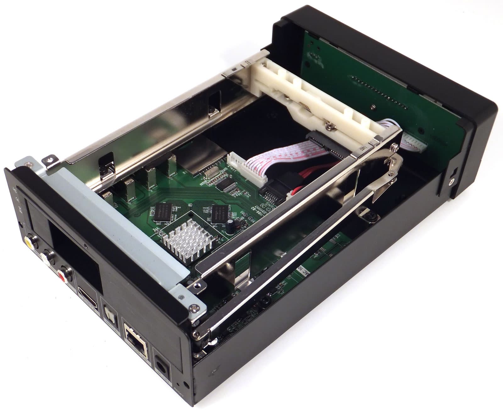 Сняв верхнюю крышку, фиксируемую с торца тремя винтиками, мы увидим нехитрую, но надёжную и действенную рычажную конструкцию салазок, куда вставляется HDD. Электроника плеера размещена на двух независимых печатных платах — основной и дополнительной, которая отвечает за работу LED-дисплея.