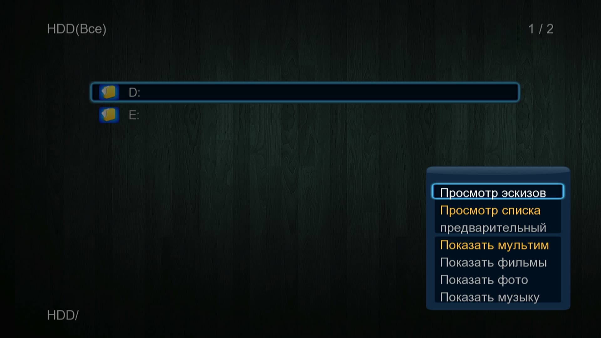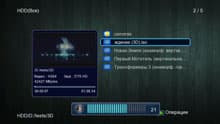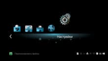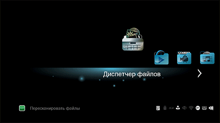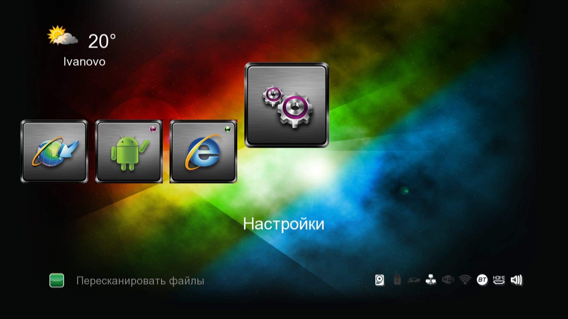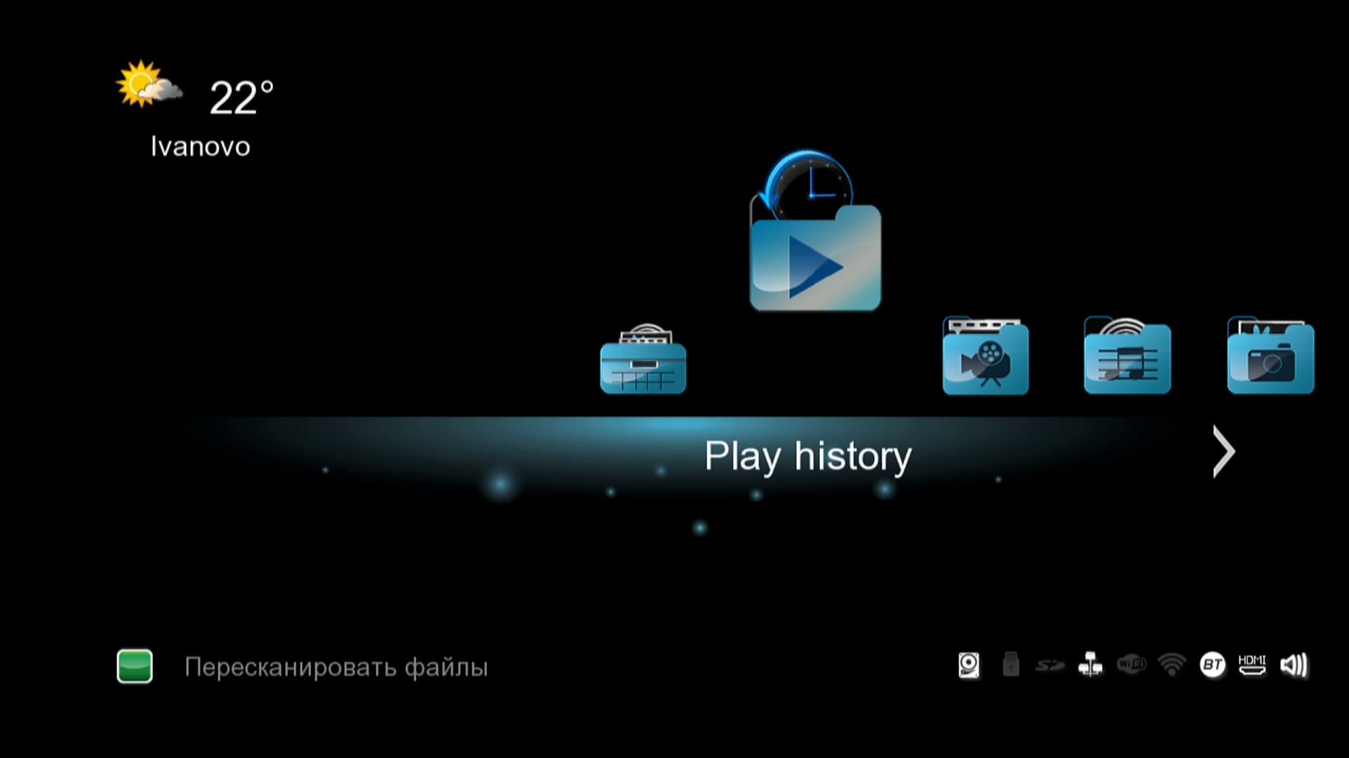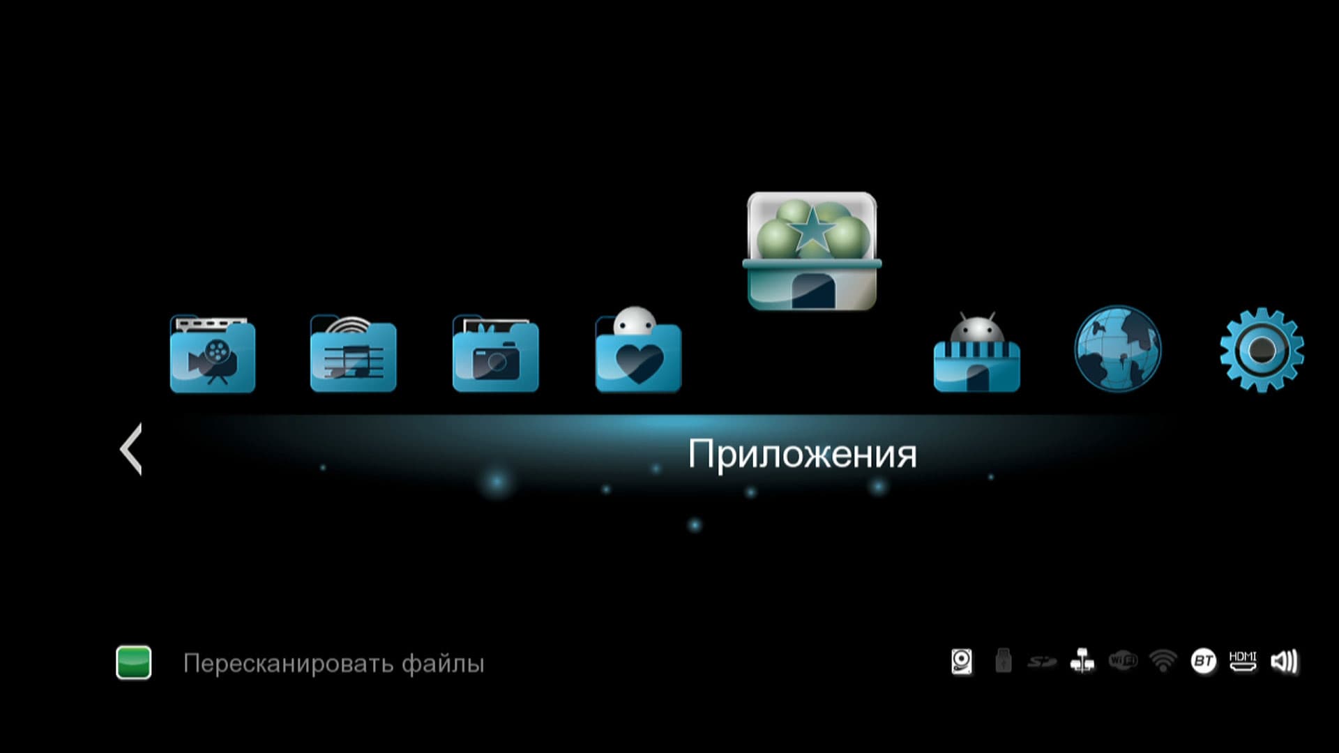 Главное стартовое окно плеера представляет собой привычный набор значков, каждому из которых присвоена какая-либо функция. Отметим наличие в нижней части экрана многочисленных иконок, сигнализирующих об активности того или иного параметра: готовности HDD, наличия подключённого USB-накопителя или карты памяти, наличия сетевого соединения и т. д. Здесь же имеется подсказка, указывающая на возможность ручной переиндексации содержимого жёсткого диска.