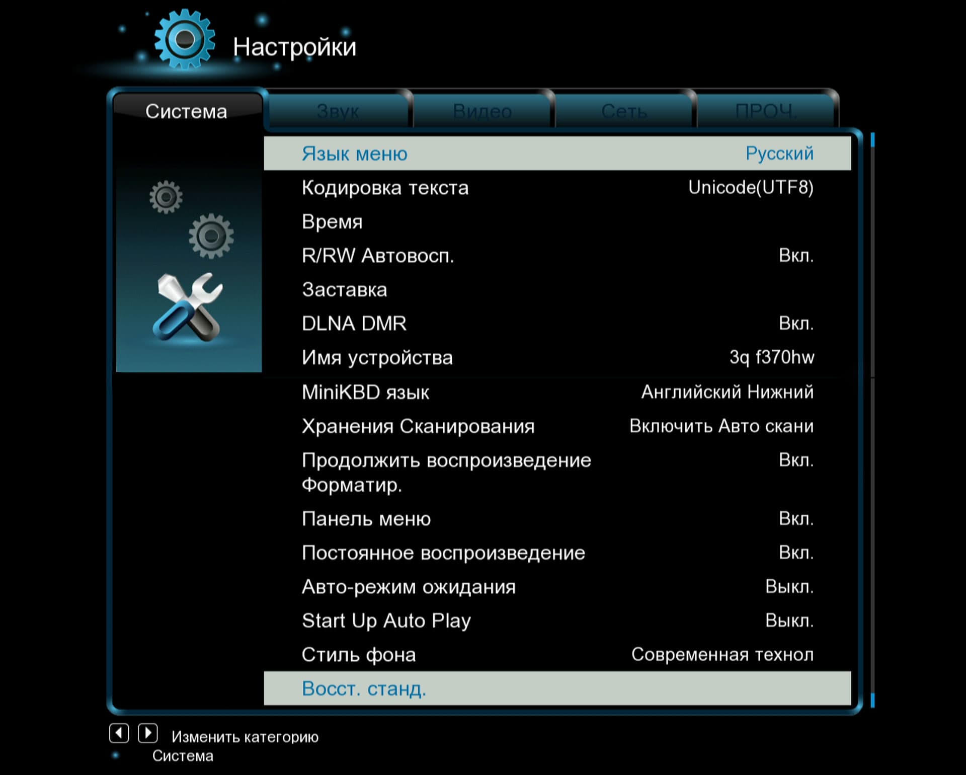 | В системных настройках можно изменить язык меню, кодировку текста (по умолчанию используется UTF8), настроить часовой пояс либо выставить текущие дату и время вручную, настроить хранитель экрана, включить возможность внешнего управления плеером (DLNA DMR), задать имя, под которым плеер будет виден в локальной сети, настроить язык виртуальной клавиатуры, включить/отключить автоматическую индексацию содержимого, активировать функцию автоматического воспроизведения файла с места последнего останова и т. д. | |