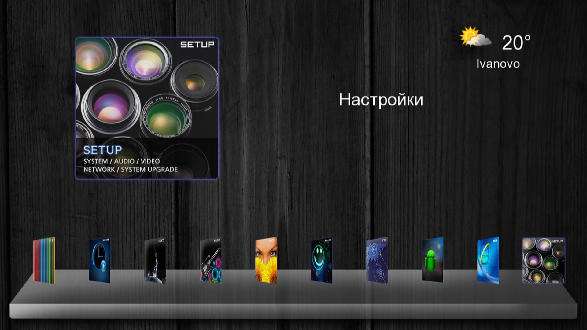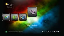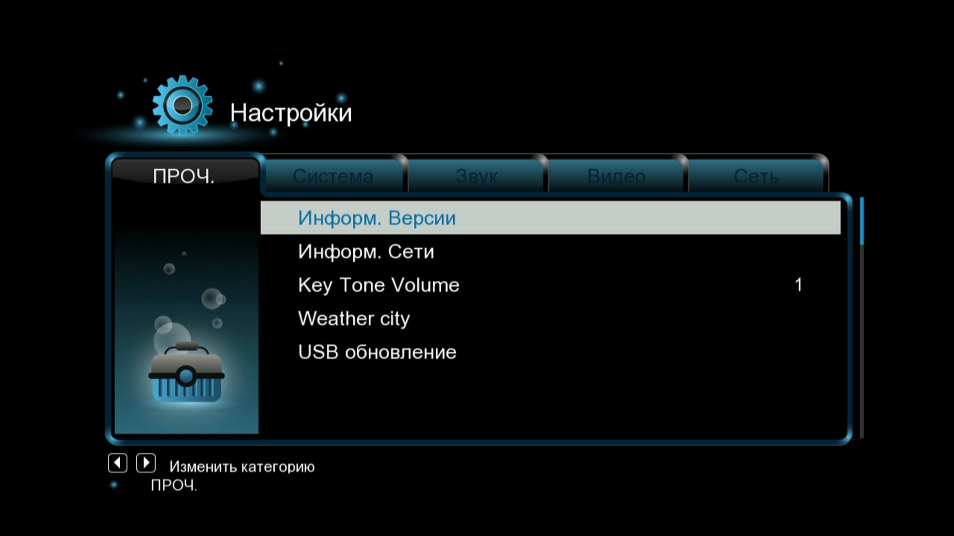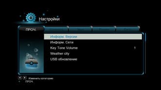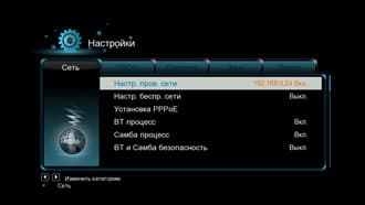 | Сетевые настройки позволяют установить проводное и беспроводное соединение, а также соединение по протоколу PPPoE, включить BitTorrent и SAMBA-сервер, активировать защищённый режим их работы с обязательным вводом логина и пароля | В пункте Проч. скопились другие, не тематические параметры: просмотр версии ПО, информация о сетевом соединении, громкость звука при нажатии кнопок пульта ДУ, выбор местоположения для корректной работы виджета погоды и пункт, через который производится обновление прошивки |