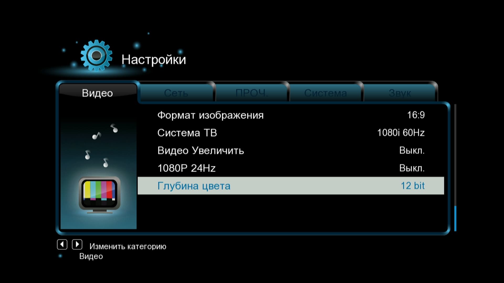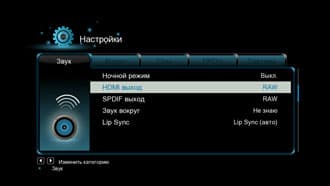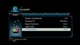 | Аудионастройки предусматривают возможность смягчения резких звуков, параметров вывода звука с цифровых выходов (LPCM — линейная импульсно-кодовая модуляция либо RAW — без обработки) | Настройки видеовыхода включают изменение аспекта кадра и ТВ-системы, активацию режима 24p для телевизоров, которые поддерживают такую систему, а также изменение глубины цвета (авто, 12 бит, 10 бит) |