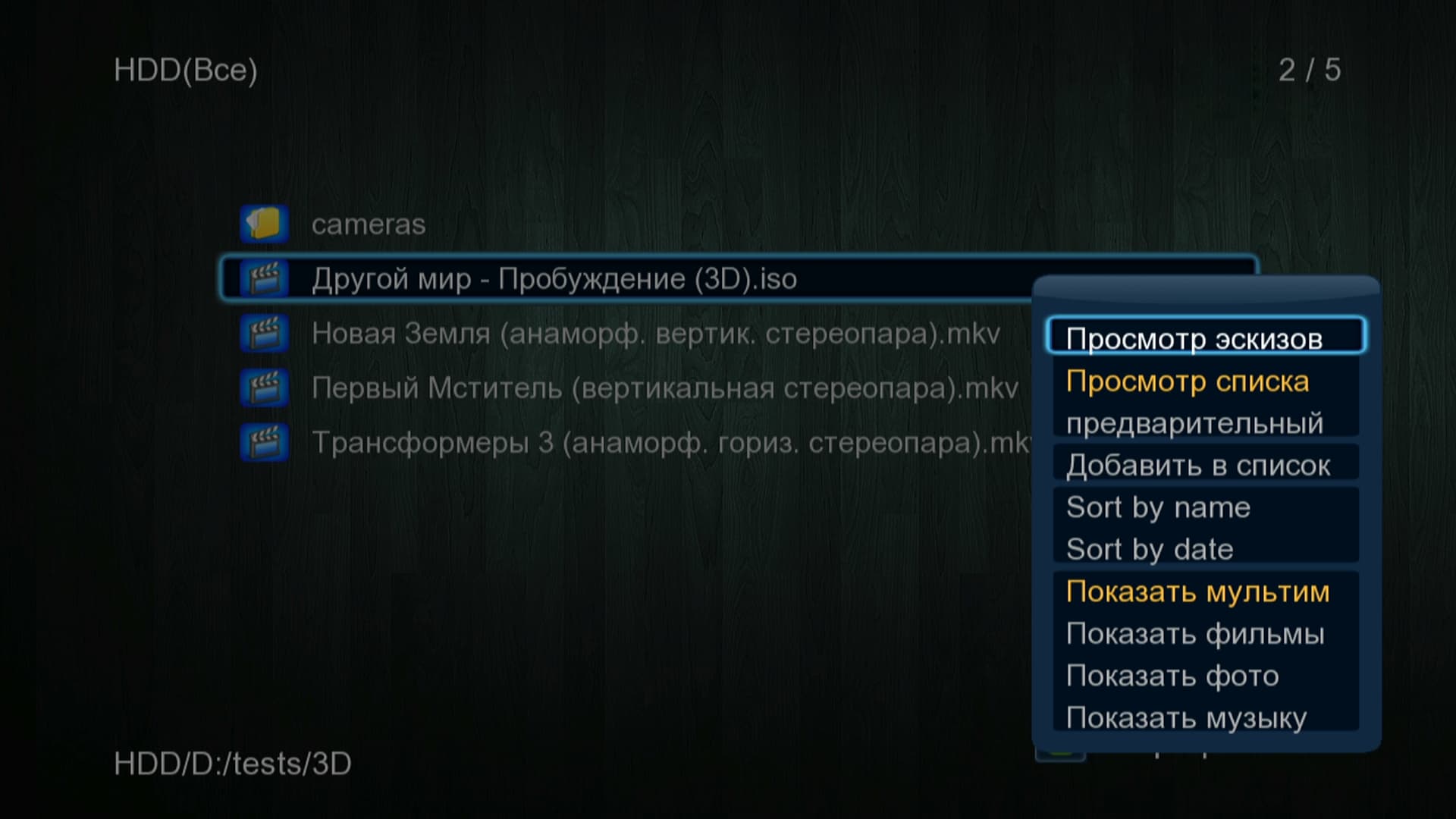Файлы, 3D-картинка в которых закодирована посредством анаморфных стереопар (вертикальной или горизонтальной), не распознаются плеером как 3D-фильмы (впрочем, это с успехом делает и 3D-телевизор). Если же и телевизор не в состоянии автоматически отличить обычный фильм от стереопары, то здесь поможет один из пунктов меню, которое вызывается при воспроизведении фильма.