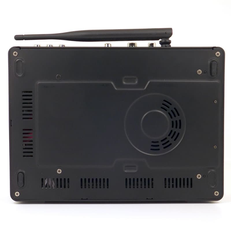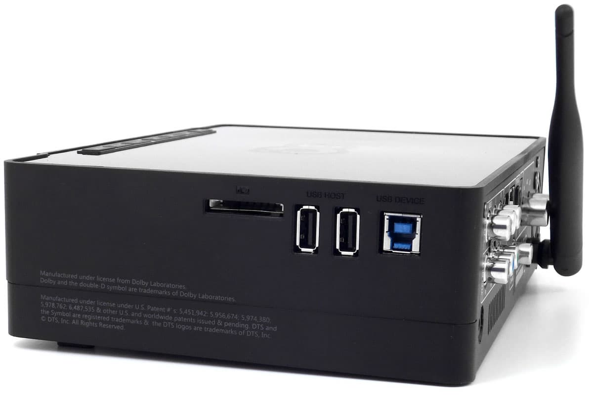 Здесь же, на задней панели, имеется несъёмная поворачивающаяся антенна встроенного адаптера Wi-Fi, а за вентиляционными отверстиями скрывается тихий вентилятор, выгоняющий нагревшийся воздух из корпуса плеера наружу.