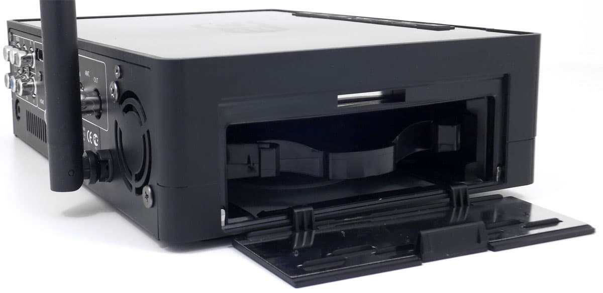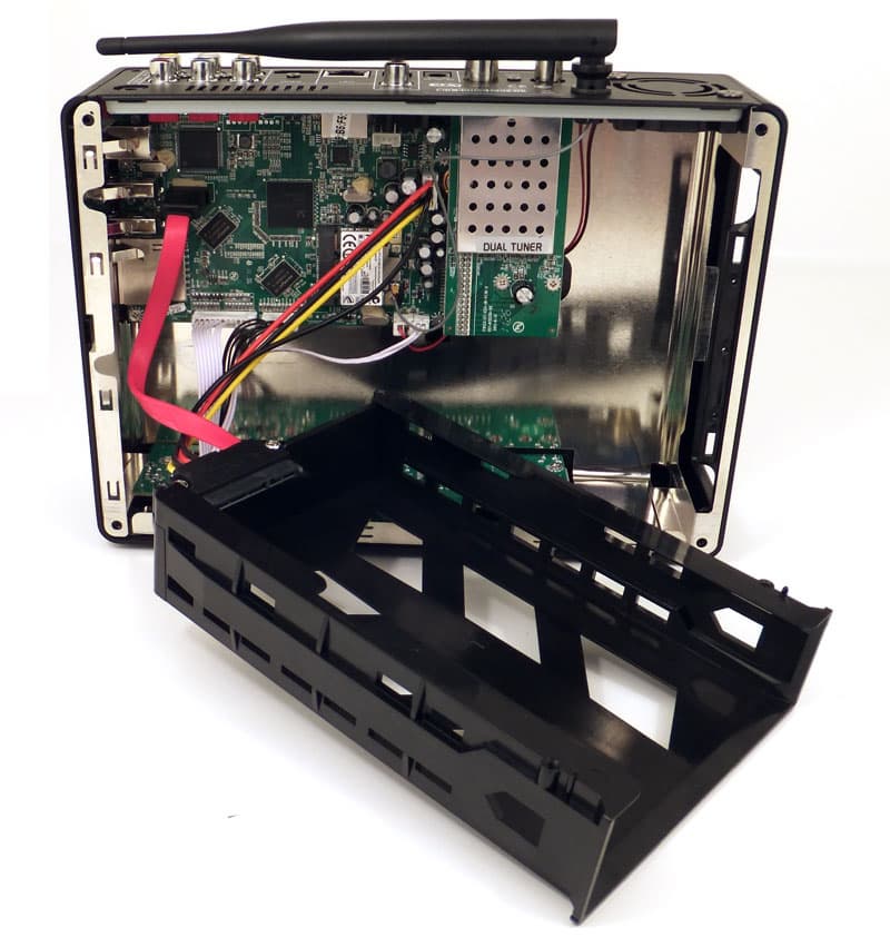 Вход в отсек для установки жёсткого диска расположен на левом торце корпуса, прикрытый откидывающейся фиксирующейся крышкой. Жёсткий диск крепится болтами в специальных пластиковых салазках, легко скользящих по направляющим внутри корпуса.