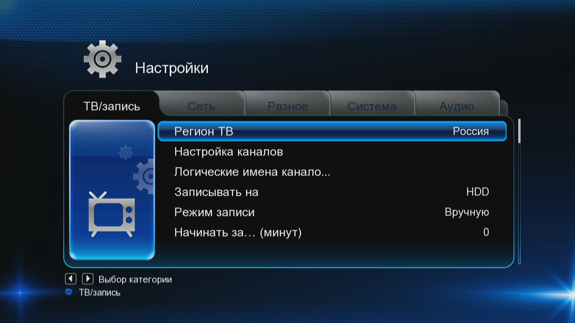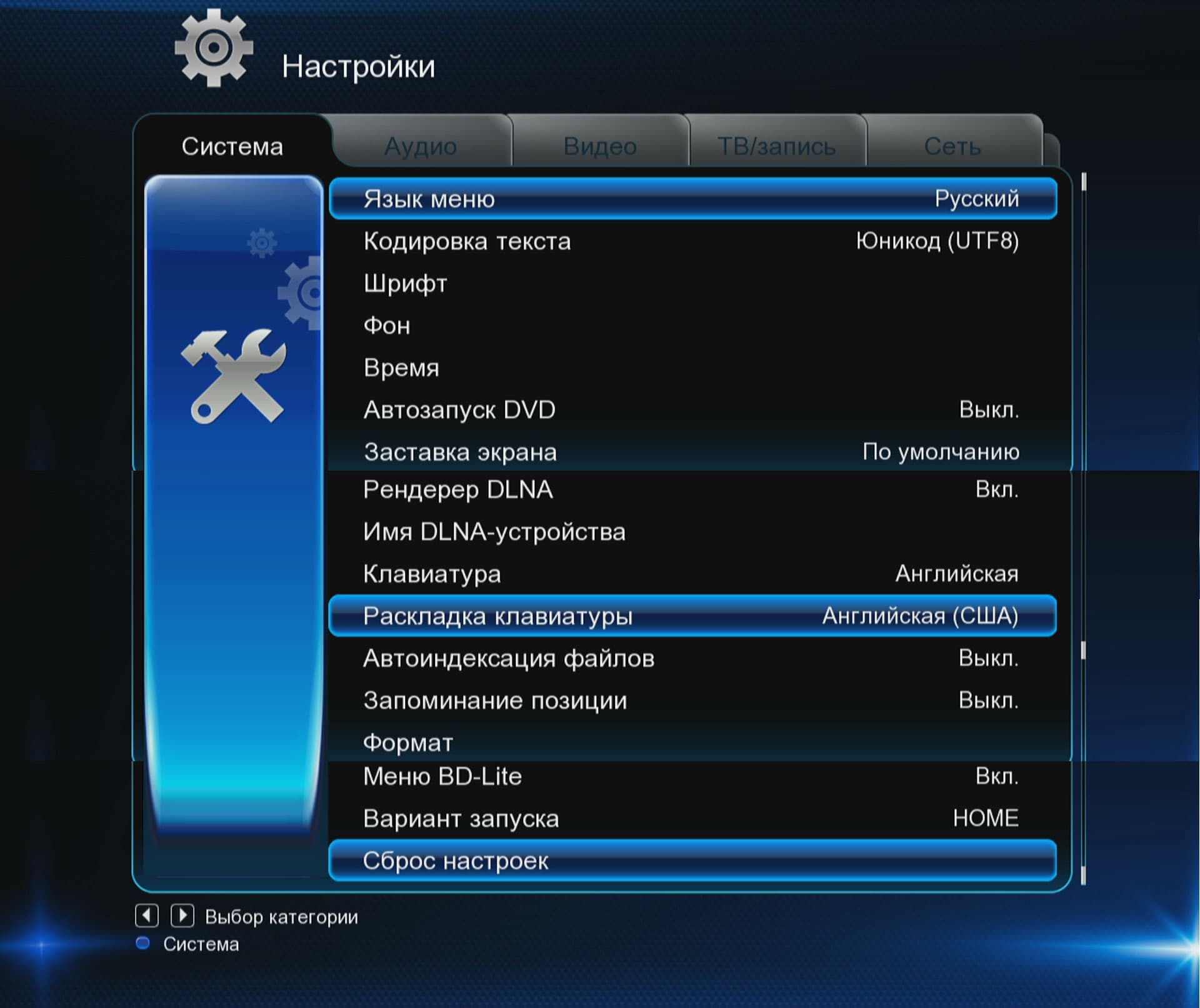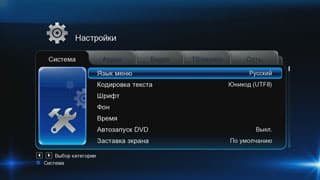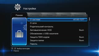 | Разное — здесь доступно изменение таких параметров, как автовыключение встроенного HDD с парковкой головок (через 5, 15 и 30 минут простоя), запуск обновления прошивки с подключённого USB-носителя, настройка защиты от детей | Системные настройки состоят из смены языка меню, кодировки текста, настройки текущего времени (для его синхронизации необходимо наличие цифрового телесигнала DVB-T), активизации хранителя экрана, выбора раскладки системной клавиатуры, форматирования жёсткого диска и прочих параметров |