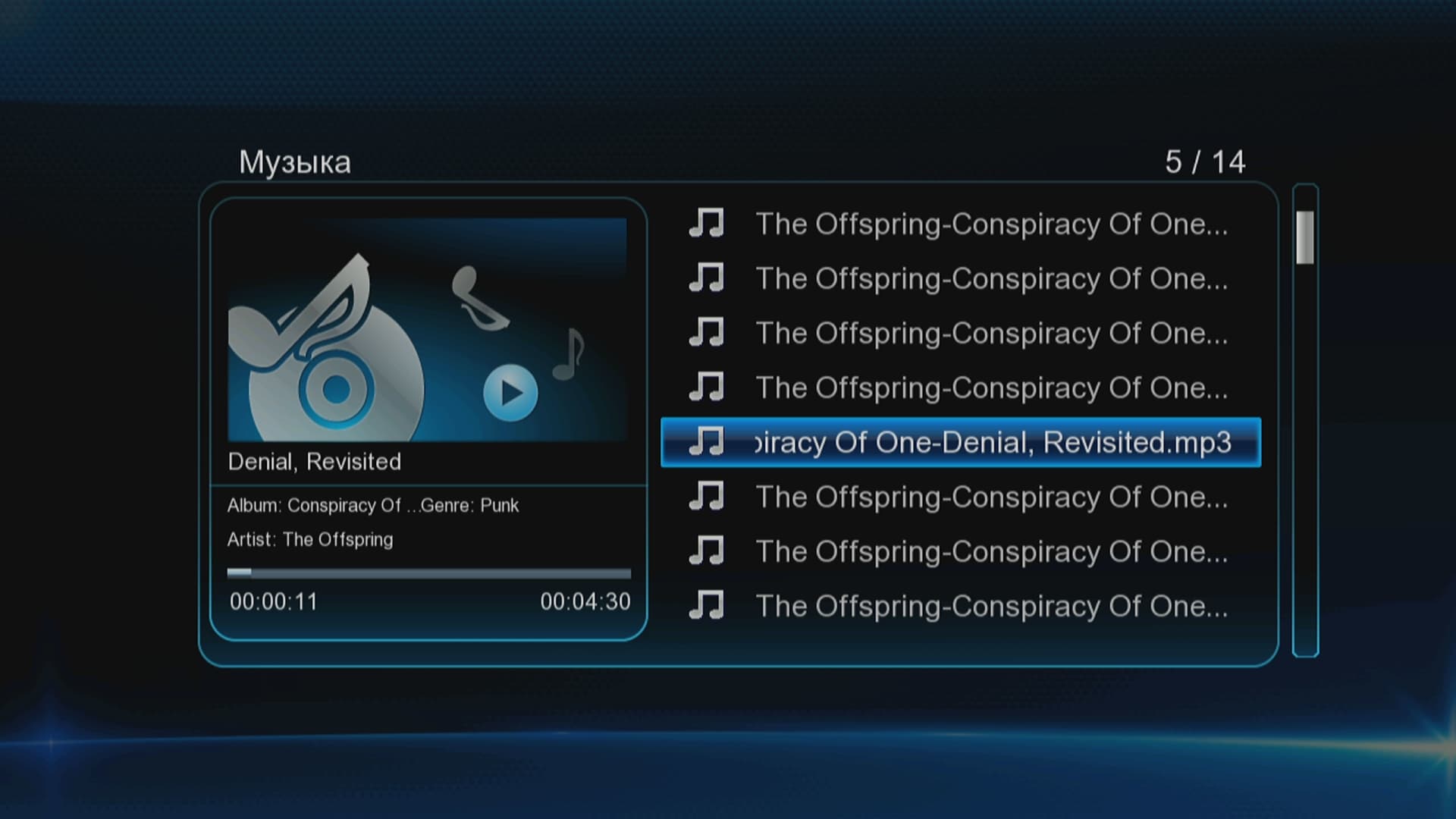 Проигрывание аудиофайлов сопровождается отображением полоски прогресса и отображением кратких сведений о файле. Плеер поддерживает списки CUE для файлов FLAC и Monkey’s Audio, что наверняка обрадует аудиофилов. Правда, остаётся одна проблема: чтобы запустить воспроизведение аудио, всё равно потребуется включить телевизор. Поскольку имеющийся в плеере символьный экран отображает лишь текущие режимы работы да время проигрывания. Названия же папок или композиций можно увидеть только на телевизоре.