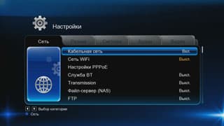 | Пункт настроек ТВ/запись состоит из выбора региона цифрового ТВ, настройки каналов и режима записи | В сетевых настройках имеется возможность изменить параметры кабельной и беспроводной сетей, включить/отключить менеджер закачек, а также Samba, FTP и UPnP серверы |