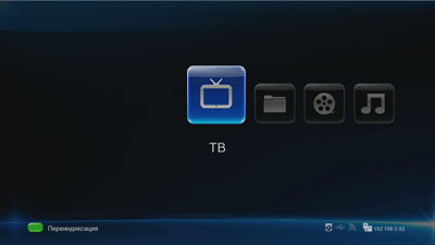 Перейдём к настройкам. Интерфейс плеера всерьёз напоминает интерфейсы устройств, построенных на таком же чипе Realtek. Лишь слегка «подточен» к данной модели плеера, с учётом его аппаратной составляющей. Здесь, на главной странице стартового меню, можно видеть пиктограммы наличия жёсткого диска, подключённых USB-устройств, активности сетей Wi-Fi или LAN, а также, что очень важно, текущий IP-адрес плеера, присвоенный ему сетевым маршрутизатором или концентратором. Поскольку доступный плееру на локальных носителях контент может сортироваться по типам видео-аудио-фото, плееру необходимо проиндексировать доступное ему медиасодержимое. Эта индексация не отнимает много времени, она включается и отключается в меню, но если требуется срочно проиндексировать подключенную флэшку, то можно воспользоваться зелёной кнопкой на пульте ДУ. Об этом напоминает подсказка, выведенная в нижней части экрана.