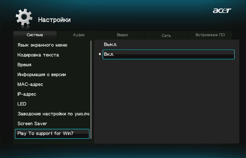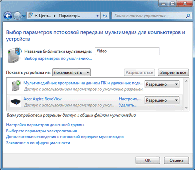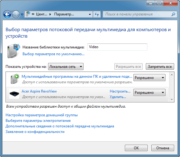 Помните пункт в настройках плеера, показавшийся нам непонятным? Этот пункт отвечает за работу инструмента Play To. Так называется функция, появившаяся в Windows 7. Она позволяет управлять совместимыми бытовыми медиаустройствами, подключёнными к локальной сети, посредством Windows Media Player. Для этого на управляющем компьютере должна быть создана Рабочая группа, также необходимо убедиться в присутствии нашего плеера в списке доступных устройств: Центр управления сетями и общим доступом → Выбор домашней группы и параметров общего доступа → Выберите параметры потоковой передачи мультимедиа.