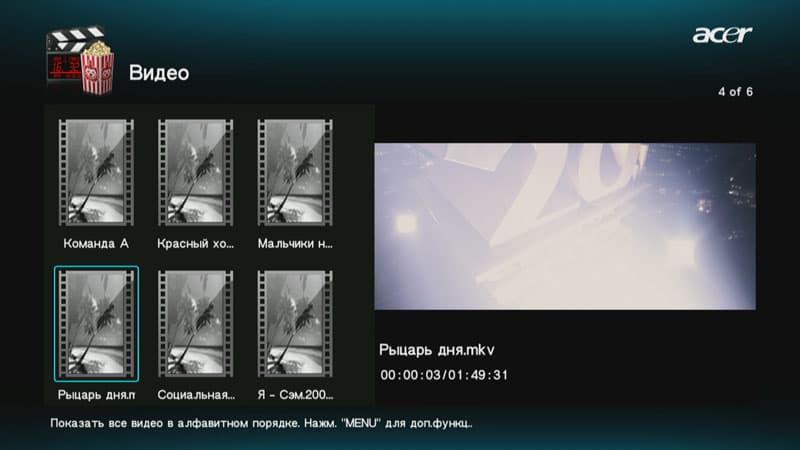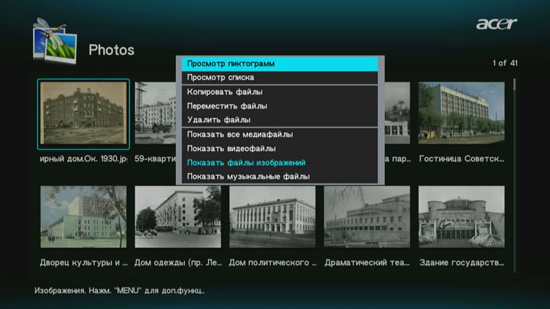Следует отметить наличие в прошивке плеера довольно удобного и функционального меню, которое появляется по нажатию соответствующей кнопки на пульте ДУ. Команды в этом меню могут различаться в зависимости от ситуации; они позволяют управлять порядком отображения контента, а также копированием/удалением/перемещением файлов и папок.