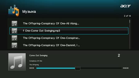 Во время проигрывания музыкальных файлов на экране нет ничего лишнего — только список воспроизведения и полоска, отображающая текущую позицию.
