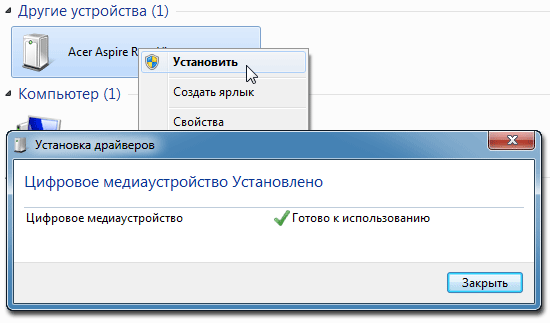 Привычка — сильная вещь. Любой сетевой плеер, включённый в локальную сеть, привычно начинаешь искать в сетевом окружении ПК, и, как правило, находишь. Данный случай не исключение — плеер присутствует в этом сетевом окружении, но компьютер видит его лишь как некое цифровое мультимедийное устройство, но никак не в качестве сетевого накопителя. При этом выпадающее меню содержит всего лишь три пункта, один из которых — Установить. Ну хорошо, установим…