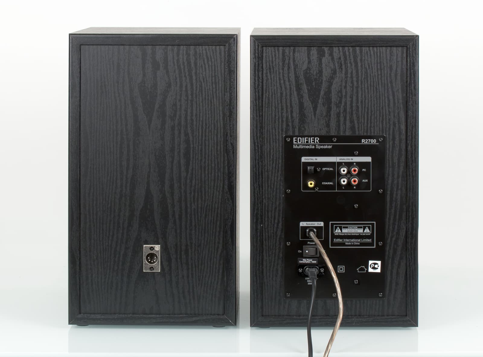 Количество регулировок, доступных с панели управления активной колонки, уже не ограничивается громкостью, как в Solo 7C: добавились регуляторы тембра НЧ и ВЧ. Все они безупорные, а нажатие на ручку регулятора громкости еще и переключает входы, что сопровождается миганием расположенного рядом небольшого оранжевого светодиода. Причем органы управления переместились на правый бок АС, а оформлены они примерно таким же пластиковым корытцем, как и в R2700. На задней стенке, помимо входных и выходных разъемов, остался только механический выключатель.